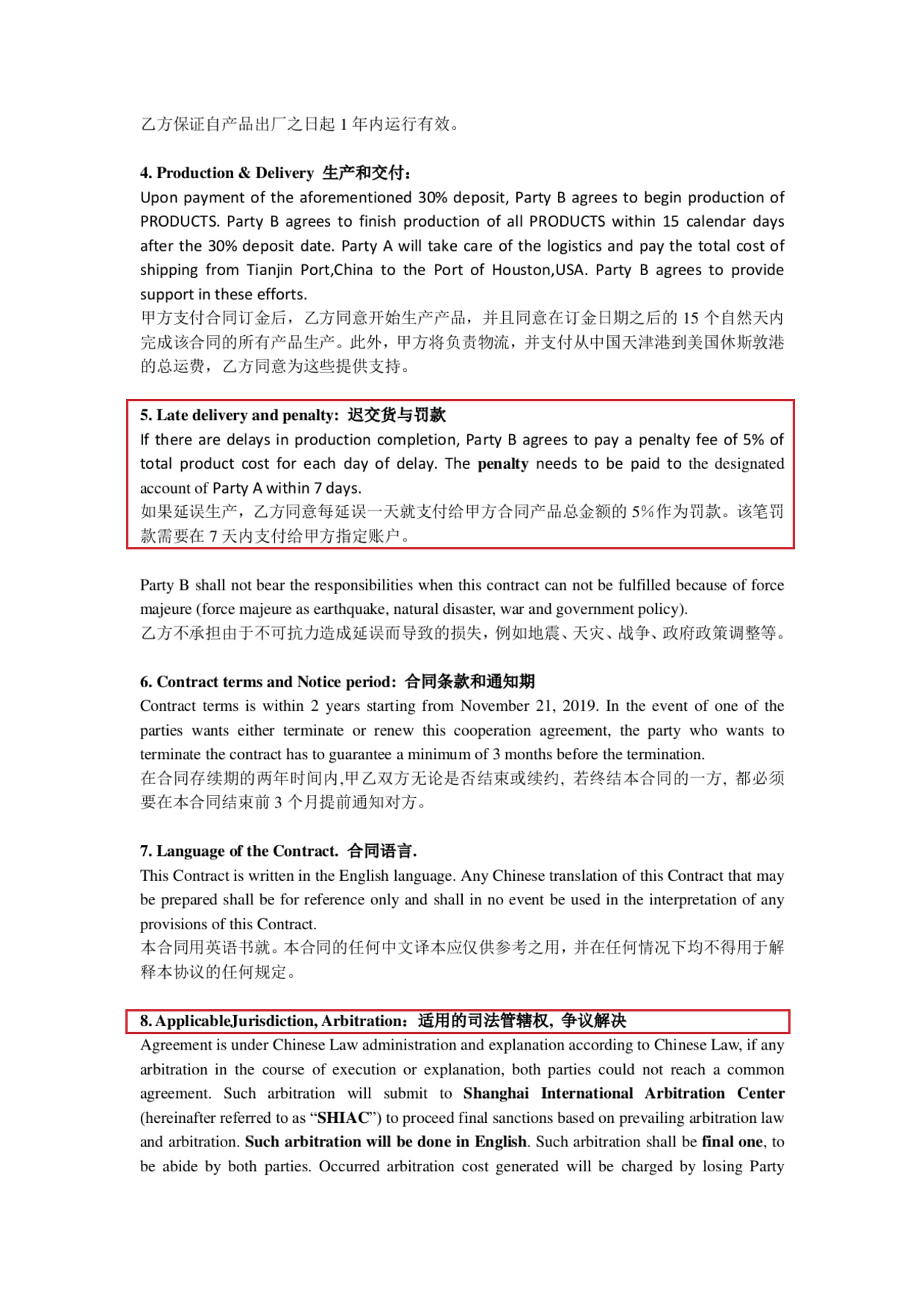 Ensure that the penalty is strong enough for the supplier to take it seriously but not scare them away. As long as the penalty is reasonable, the contract can be enforced in the Chinese courts directly, which will save you a lot of trouble because it is difficult to prove how much loss you have suffered without a pre-agreed compensation clause. In addition, the fines agreed in advance save the judge a lot of time and make his job more manageable. If you don’t state the penalty, he may ask both parties to give an amount they think is fair, and the judge will compromise. This method rarely benefits the injured party. So obviously, it would be better to have a penalty in front.