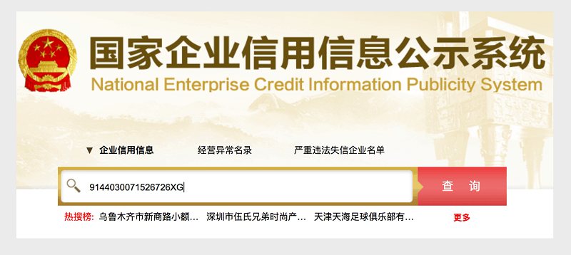 After reaching the website, you need to type your suppliers’ business registration number. You can find this number on the copy of the business license the supplier has sent you. In the case of Tencent, the business registration number looks like this: 9144030071526726XG.